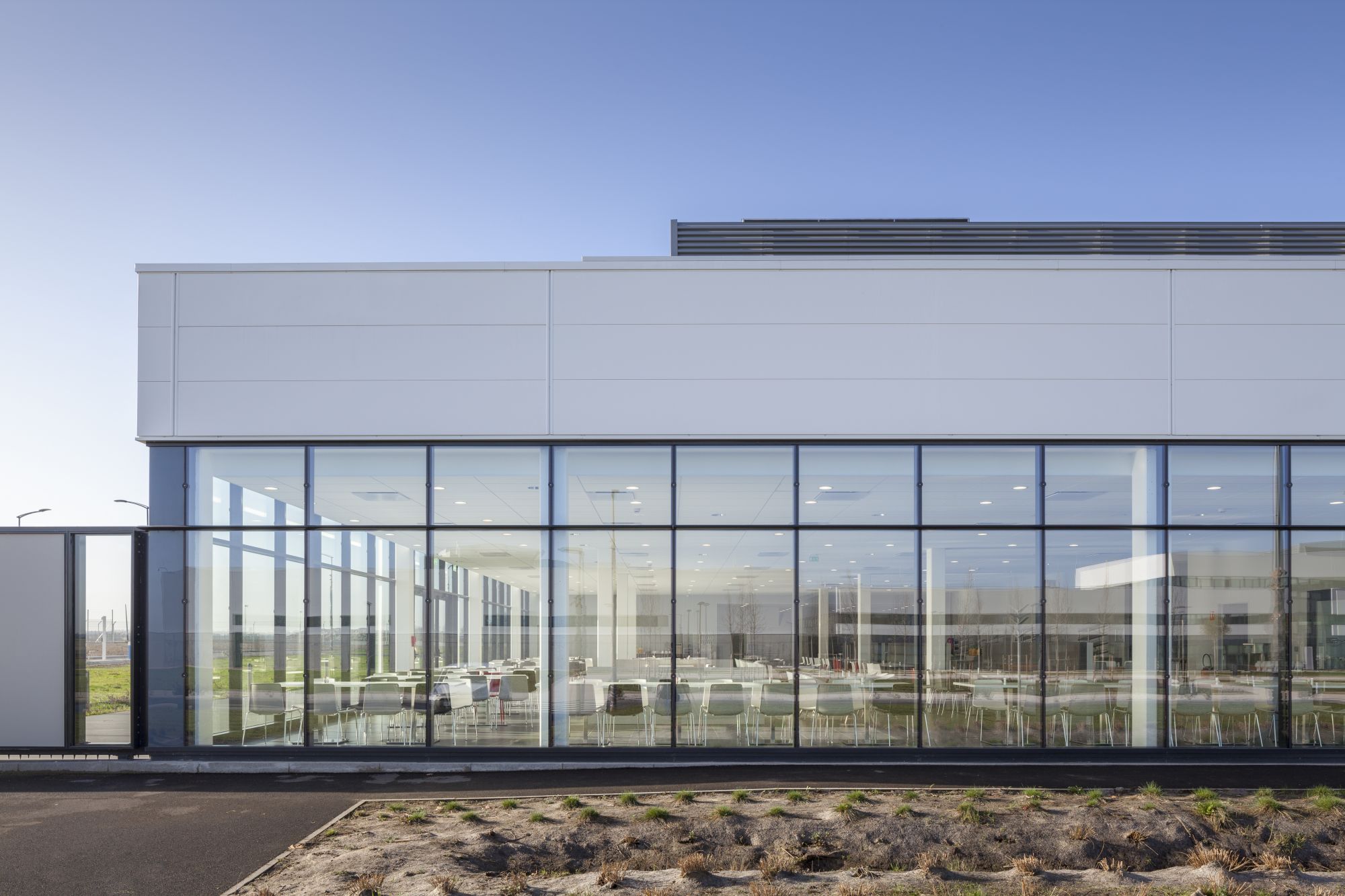 Autour de la chaine de production se greffent en étoile les autres éléments du programme : un bâtiment d’accueil, un centre de formation, un laboratoire de recherche, des bureaux administratifs et ceux de la Direction sur 10 000 m², des salles de réunion, un restaurant-cafétéria de 300 couverts et des zones logistiques. Les bâtiments tertiaires sont éloignés des pistes et positionnées de manière indépendante pour être protégés des nuisances sonores et pour des raisons de sécurité incendie. La position du bâtiment de Direction, sur l’axe des entrées lui confère une double visibilité.
