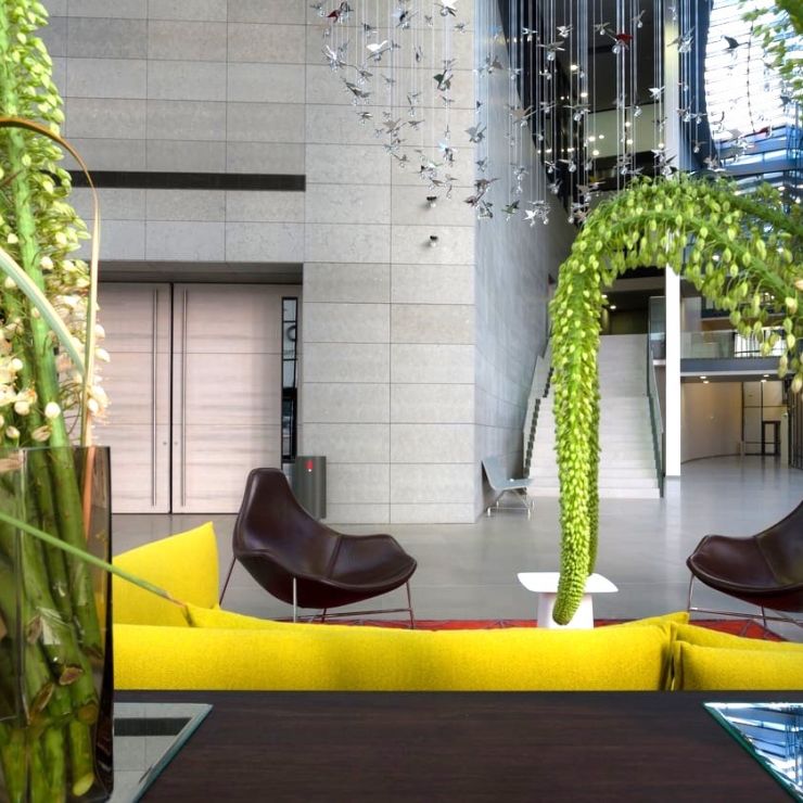 Autour de la chaine de production se greffent en étoile les autres éléments du programme : un bâtiment d’accueil, un centre de formation, un laboratoire de recherche, des bureaux administratifs et ceux de la Direction sur 10 000 m², des salles de réunion, un restaurant-cafétéria de 300 couverts et des zones logistiques. Les bâtiments tertiaires sont éloignés des pistes et positionnées de manière indépendante pour être protégés des nuisances sonores et pour des raisons de sécurité incendie. La position du bâtiment de Direction, sur l’axe des entrées lui confère une double visibilité.